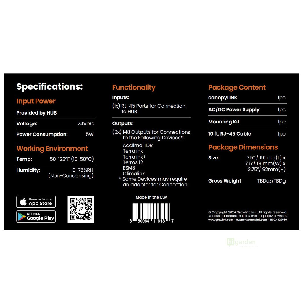CanopyLINK verbindet bis zu acht Sensoren, einschließlich Terralink Bodensensoren und Climalink Klimasensoren, über HUB oder Wi-Fi mit dem Growlink-System. Vereinfacht die Erfassung von Daten über Substrat, Klima und Licht, was eine präzise Steuerung und Optimierung des Pflanzenwachstums ermöglicht.