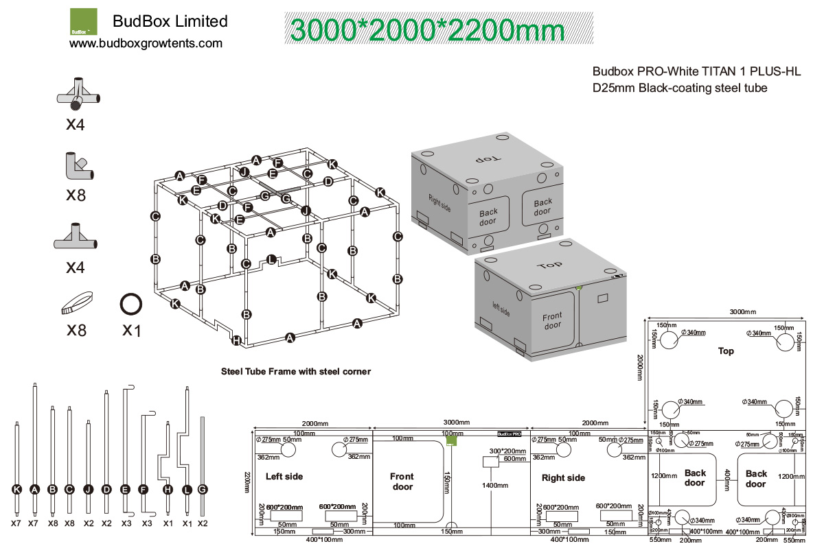 pRO Titan I+ HL 200 ist für HPS- und LED-Beleuchtung konzipiert. Er besteht aus 100 % porenfreiem, 4-lagigem Material, das ungiftig ist, und einer Metallkonstruktion mit hochwertiger Verarbeitung. die BudBox-Zelte sind jetzt mit Push- und Click-Fit-Verbindungen aus Stahl ausgestattet, die für zusätzliche Stabilität bei all Ihren Anforderungen in Bezug auf Filter, Ventilatoren und Beleuchtung sorgen, sowie mit stärkeren, gehärteten Stahlstangen. Das neue PRO-Modell zeichnet sich durch Verbesserungen wie neue patentierte undurchsichtige Reißverschlüsse, Metallkupplungen und einen unteren Rahmen aus, der speziell für die Entwässerung von Bewässerungsanlagen entwickelt wurde. Außerdem ist das Zelt ohne untere Querrohre und hat einen flachen Boden. Seine Luftkanäle sind jetzt breiter (es können Sono-Kanäle verwendet werden).