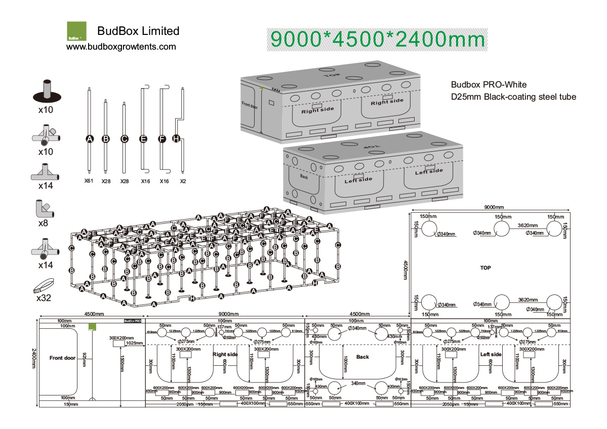 Budbox PRO Titan IX ist für alle Beleuchtungsarten geeignet (HPS, MH, CFL, LED, CMH, DE). Er besteht aus 100 % porenfreiem, 4-lagigem Material, das ungiftig ist, und einer Metallkonstruktion mit hochwertiger Verarbeitung. die BudBox-Zelte sind jetzt mit Push- und Click-Fit-Verbindungen aus Stahl ausgestattet, die für zusätzliche Stabilität bei all Ihren Anforderungen in Bezug auf Filter, Ventilatoren und Beleuchtung sorgen, sowie mit stärkeren, gehärteten Stahlstangen. Das neue PRO-Modell zeichnet sich durch Verbesserungen wie neue patentierte undurchsichtige Reißverschlüsse, Metallkupplungen und einen unteren Rahmen aus, der speziell für die Entwässerung von Bewässerungsanlagen entwickelt wurde. Außerdem ist das Zelt ohne untere Querrohre und hat einen flachen Boden. Seine Luftkanäle sind jetzt breiter (es können Sono-Kanäle verwendet werden). Das Zelt ist mit einem einzigartigen Sichtfenster aus grüner Folie ausgestattet, durch das Sie die Pflanzen auch dann beobachten können, wenn sie schlafen. Der untere Rahmen ist speziell für das Abflussrohr erhöht.