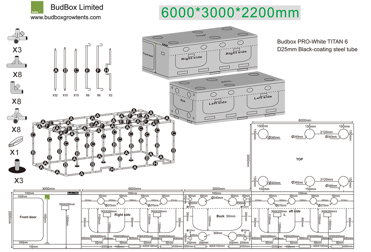 Budbox PRO Titan VI ist für alle Beleuchtungsarten geeignet (HPS, MH, CFL, LED, CMH, DE). Er besteht aus 100 % porenfreiem, 4-lagigem Material, das ungiftig ist, und einer Metallkonstruktion mit hochwertiger Verarbeitung. die BudBox-Zelte sind jetzt mit Push- und Click-Fit-Verbindungen aus Stahl ausgestattet, die für zusätzliche Stabilität bei all Ihren Anforderungen in Bezug auf Filter, Ventilatoren und Beleuchtung sorgen, sowie mit stärkeren, gehärteten Stahlstangen. Das neue PRO-Modell zeichnet sich durch Verbesserungen wie neue patentierte undurchsichtige Reißverschlüsse, Metallkupplungen und einen unteren Rahmen aus, der speziell für die Entwässerung von Bewässerungsanlagen entwickelt wurde. Außerdem ist das Zelt ohne untere Querrohre und hat einen flachen Boden. Seine Luftkanäle sind jetzt breiter (es können Sono-Kanäle verwendet werden). Das Zelt ist mit einem einzigartigen Sichtfenster aus grüner Folie ausgestattet, durch das Sie die Pflanzen auch dann beobachten können, wenn sie schlafen. Der untere Rahmen ist speziell für das Abflussrohr erhöht.