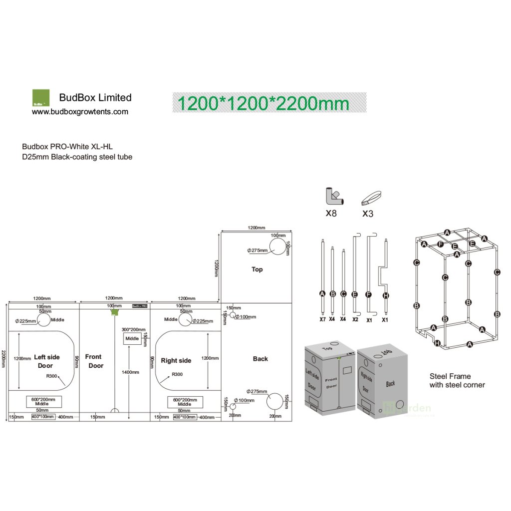 das BudBox XL-HL ist ein hochwertiges Anbauzelt sowohl für professionelle Züchter als auch für Heimanbauer. HL bezieht sich auf die oben genannte Standardhöhe von 220 cm. Er besteht aus 100 % porenfreiem, 4-lagigem Material, das ungiftig ist, und einer Metallkonstruktion mit hochwertiger Verarbeitung.