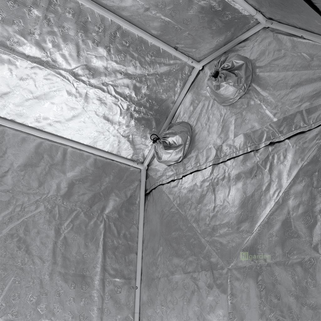 Außerdem bietet er viele Anschlussmöglichkeiten für Belüftung, Kabeldurchführungen - alles mit doppeltem Pull-Down-Verschluss. Das Zelt besteht aus strapazierfähigem Tri-Layer 600 Denier Material mit einer reflektierenden Oberfläche namens UltraLux, die bis zu 30 % mehr Reflektionsvermögen bietet als herkömmliche Produkte. Das Zelt hat Tivax-Reißverschlüsse, die an allen Eingängen angebracht sind und die Fähigkeit bestätigen, im geschlossenen Zustand gut abzudichten.