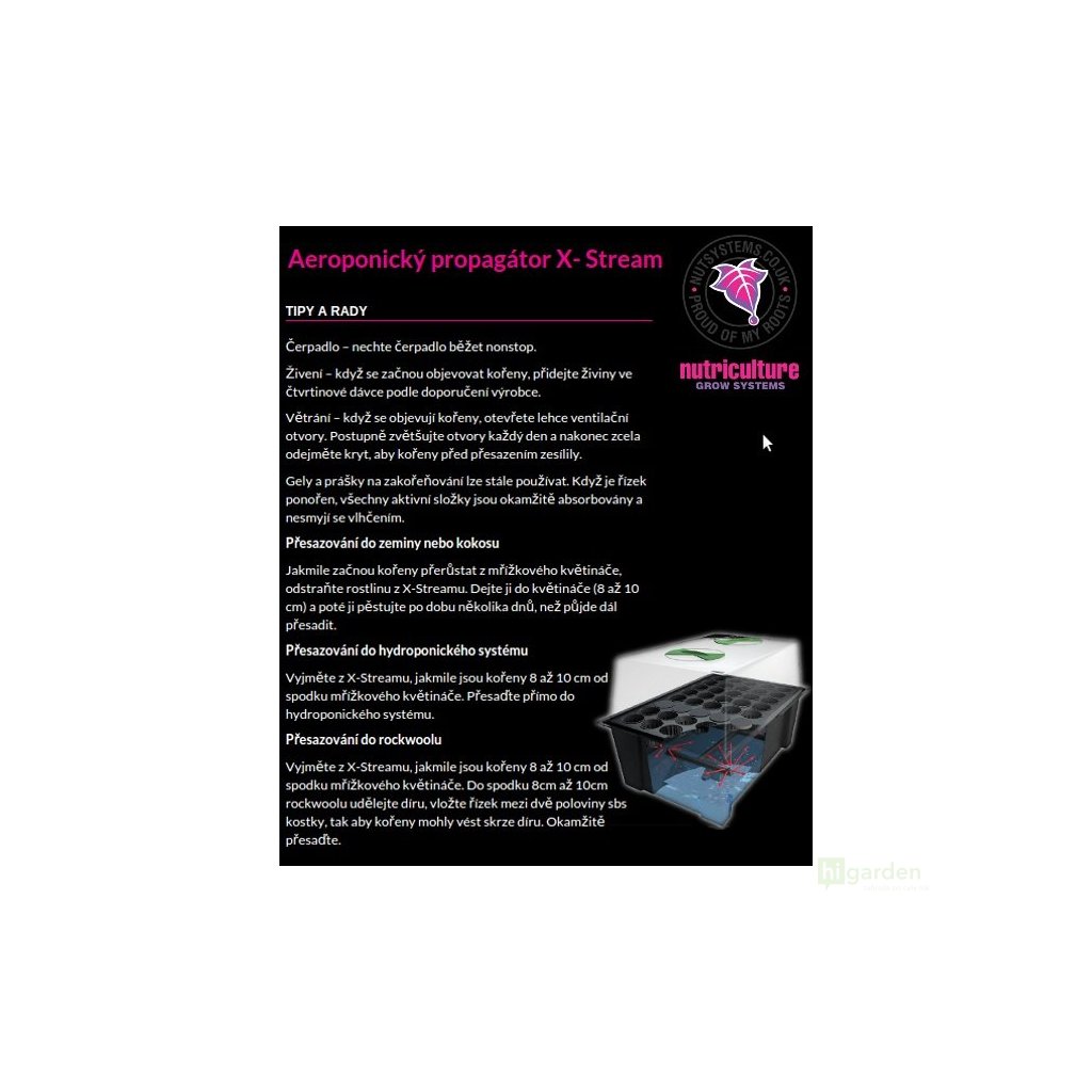 Nutriculture 's X-Stream 12 bietet den Pflanzen die perfekte Umgebung, um ihr Wurzelsystem richtig zu entwickeln, was die Chancen auf perfekte Ergebnisse erhöht. Das ungenutzte Wasser wird im Kreislauf geführt und wiederverwendet. Luftfeuchtigkeit und Temperatur können mit Hilfe von Lüftungsklappen geregelt werden. Dank des transparenten Deckels haben die Pflanzen viel Licht, aber die Wurzeln sind davor gut versteckt.