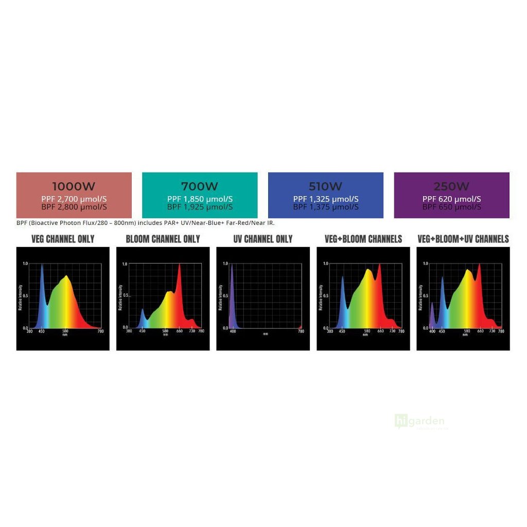 Eine der interessantesten Funktionen, die allen Modellen gemeinsam ist, ist die Dreikanalsteuerung. Drei separate Treiber steuern die VEG-, BLOOM- und UV-Dioden, was bedeutet, dass Landwirte krankheitsresistentere Mutter- und Jungpflanzen produzieren, die Stängelverlängerung beim Übergang reduzieren und die Produktion von Biomasse und ätherischem Öl in der Blüte steigern können.