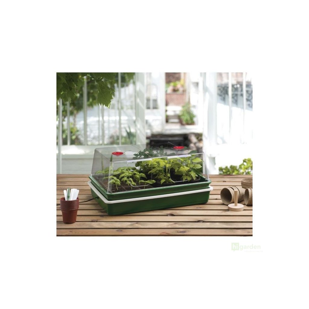 Das beheizte Gewächshaus ohne Thermostat hat Lüftungsklappen und ist mit den gängigen Pflanzsubstraten kompatibel. Die Produktbasis besteht aus einer Tragschicht ohne Drainage. Der Subrack ist mit einem Kabel zum Netzwerk ausgestattet.