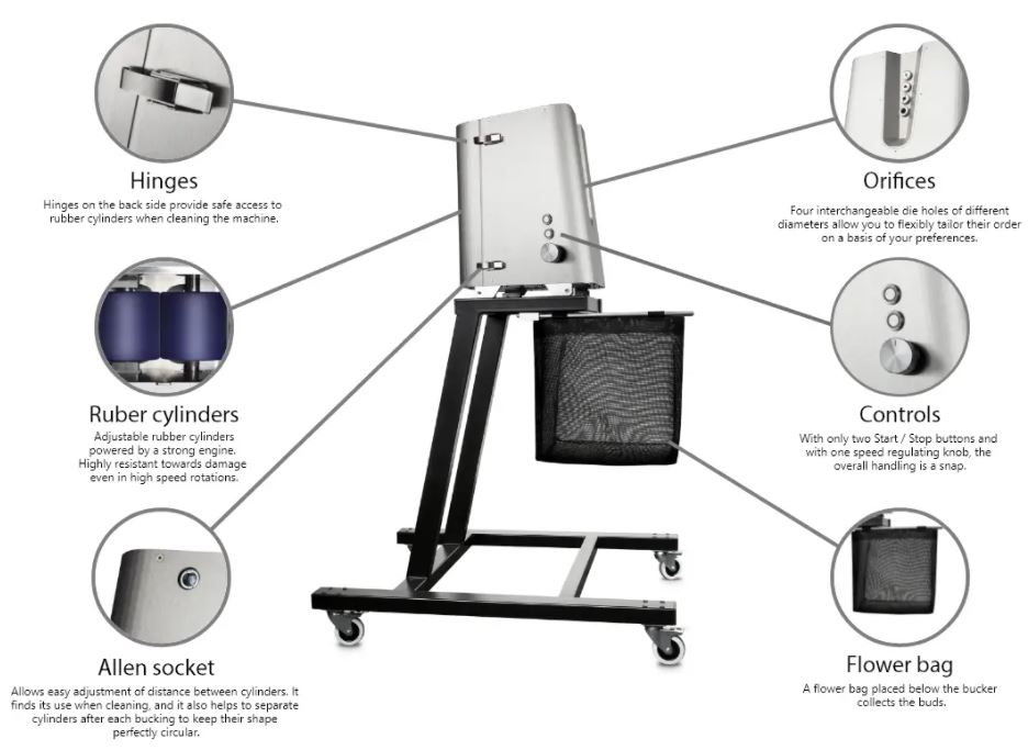 Mit einem robusten Edelstahlgehäuse und einem leistungsstarken Motor und einer Kapazität von bis zu 60 Kilogramm pro Stunde beschleunigt er den Vorschneideprozess. Mit den vier verschiedenen Lochdurchmessern können Sie Blumen unterschiedlicher Größe perfekt zupfen, von massiven Stielen bis zu kleinen Seitenzweigen.