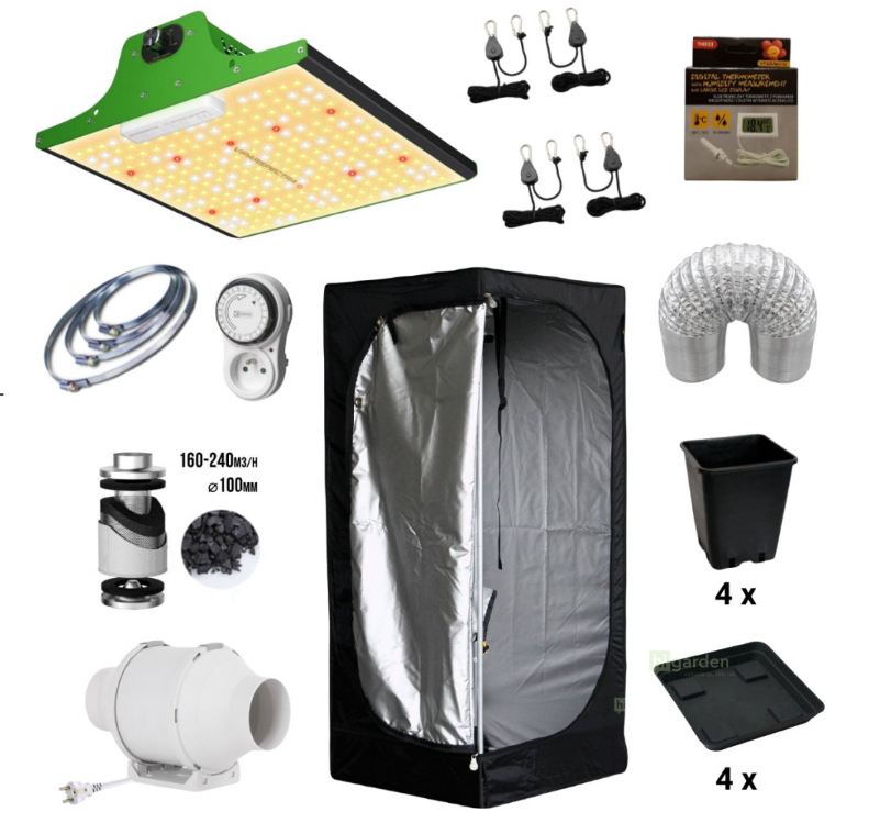 Unser TIPP: Ein hervorragendes Preis-Leistungs-Verhältnis sich ergänzender Anbautechniken bieten Growbox-Sets – Komplettsets, die man nur noch anschließen und beobachten muss, wie sich die Pflanzen entwickeln. Eine grundlegende LED-Set-Konfiguration mit 100 W siehst du zur Veranschaulichung auf dem Bild, aber mehr oder weniger ausgeklügelte Konfigurationen passen wir auch gerne an deine Vorstellungen an. Dann kannst du bequem zu Hause mehrmals im Jahr ernten!